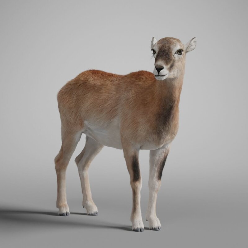 This is a high-quality female mouflon model, featuring textures, fur, rigging, and animations. The model has realistic muscle structure; the textures are in UDIM format with 4K resolution, making the effect more realistic. Additionally, it includes four lively and realistic animations. This model is made with Blender and Cycles renderer at real-world scale.