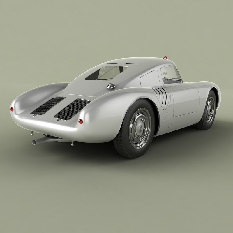 High detailed, correctly scaled model of 1956 Porsche 550 A Coupe. Originally created with 3ds Max 8. Rendered with V-Ray , files with standard materials are included. Unit system is set to metric units. Model is built to real world scale. Geometry is Editable Poly (quads/tris only). TurboSmooth is use separately to objects (74 of 101 named objects) with iterations 2 ( 786128 polys, 409647 vert.). Each file was checked before upload. Materials and textures are included (6 textures - jpg 1024X1024).