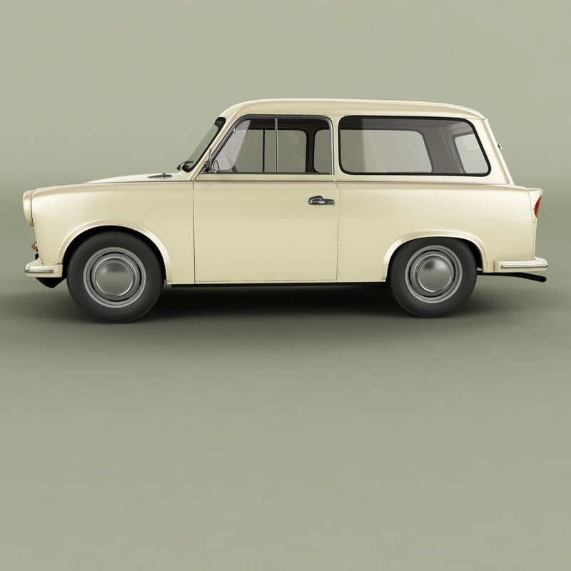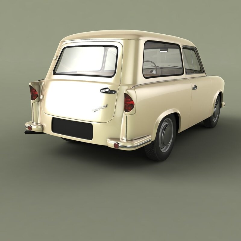 High detailed, correctly scaled model of 1958 Trabant P50 Kombi. Originally created with 3ds Max 8. Rendered with V-Ray, files with standard materials are included. Unit system is set to metric units. Model is built to real-world scale. Geometry is Editable Poly (quads/tris only). TurboSmooth is use separately to objects (78 of 110 named objects) with iterations 2 ( 786072 polys, 407281 vert.) Each file was checked before upload. Materials and textures are included (4 textures - jpg 1024X1024).
