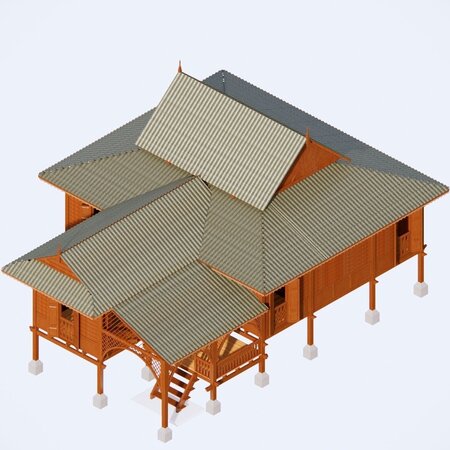 this 3d model is a traditional Malay house located in Perak,Malaysia, this house is known as Rumah Limas Potong Perak because of its roof. the roof is a hip roof with a combination of gable roof in the middle creating a unique style and identity of malay houses. this house is like an extention to the rumah tiang 12. every malay houses will start built in a grid form. starting with 6 poles or tiang 6 to 12 poles ,tiang 12 and when the family is getting bigger the house will expand and can be up to 24 poles or tiang 24 .it is usually built for middle class family and can be seen across the Malaysia peninsular. the structure is fully using a solid wood specifically the Cengal timber while the other parts use meranti timber. the 3d model was made and create in sketchup and rendered using enscape version 3.1. the outcome may vary depends on the software you are using. it is scaled 1:1 following the real dimension.