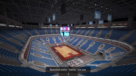 Detailed basketball real-world size arena with 18468 seats, 3 types of terrain, top ads, oval ads, large scoreboard, ball, two levels of VIP rooms and seats, tables, detailed roof construction, and many more... The color of the court, red, blue, and neutral.