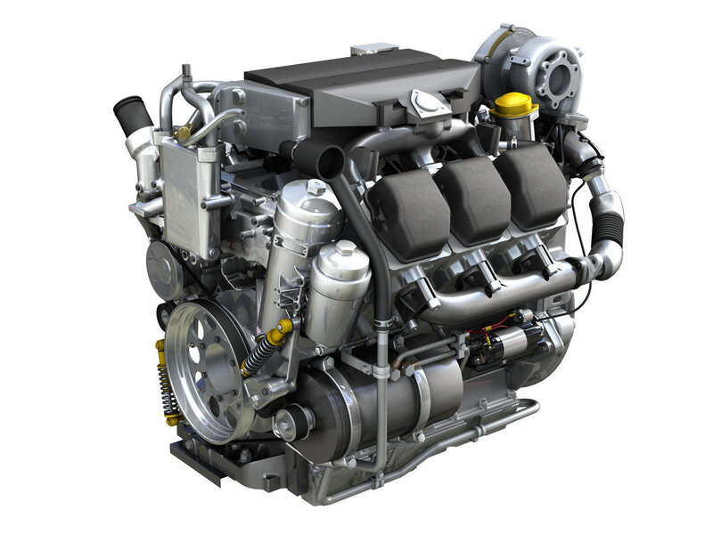 Diesel engine with 6 cylinders in Vee-type Konfiguration with inner workings parts in an schematic manner.