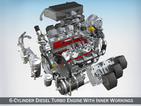 Diesel turbo engine with 6 cylinders and inner workings.